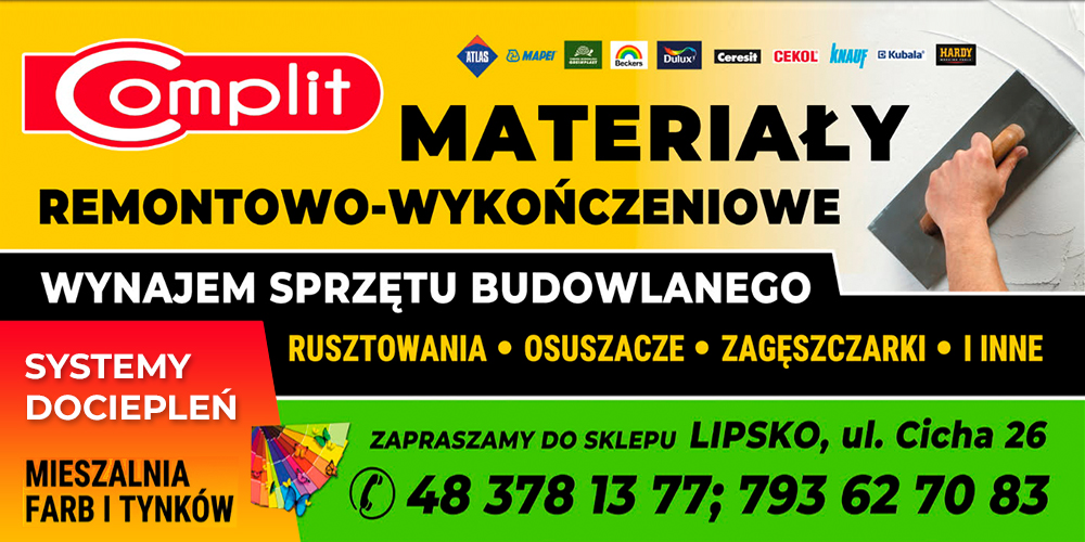 Complit Lipsko to idealne miejsce dla wszystkich poszukujących wysokiej jakości materiałów budowlanych i remontowych. Nasza oferta obejmuje szeroki zakres produktów. Nie ważne, czy prowadzisz duży remont czy drobne poprawki w domu, w Complit Lipsko znajdziesz wszystko, czego potrzebujesz, by zakończyć swoje projekty z sukcesem. Nasze produkty są wysokiej jakości i spełniają najwyższe standardy branżowe.   OFERUJEMY: MATERIAŁY REMONTOWO-WYKOŃCZENIOWE RENOMOWANYCH FIRM - FARBY - LAKIERY - KLEJE - ZAPRAWY - SZPACHLE OFERUJEMY PEŁNY ZAKRES USŁUG REMONTOWO-BUDOWLANYCH PODŁOGI - SPRZEDAŻ - MONTAŻ ART. ELEKTRYCZNE I KARNISZE