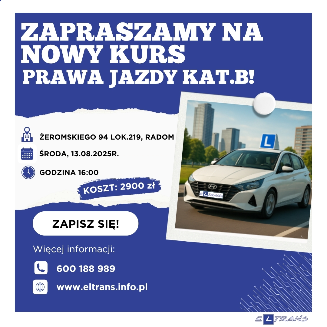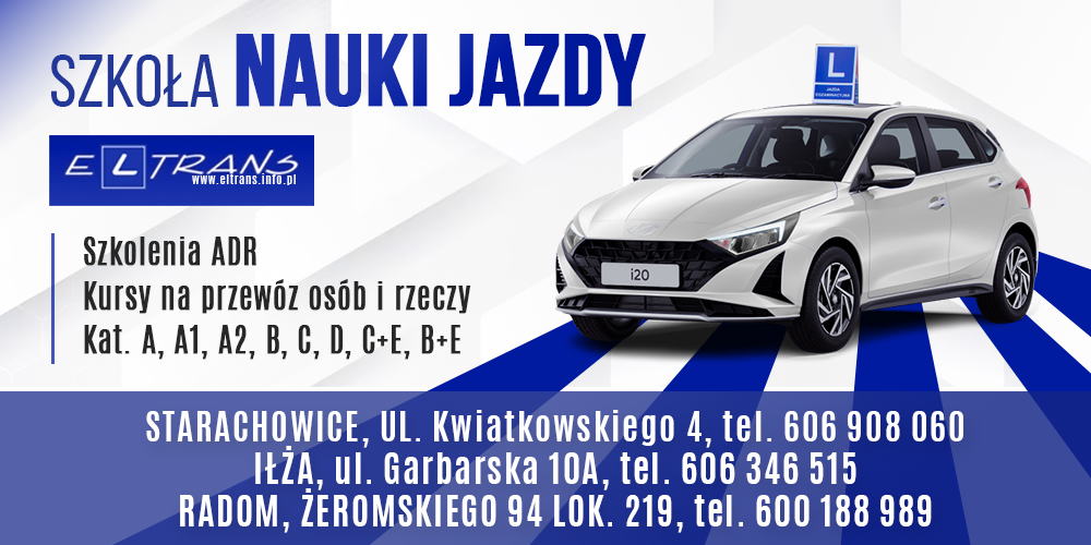 Szkoła jazdy El-Trans mieści się w 3 lokalizacjach – w Radomiu, Starachowicach oraz Iłży. Nasza oferta obejmuje aż 10 różnych kategorii – m.in. kategorię A, B i C – a także jazdy doszkalające oraz profesjonalne szkolenia na instruktora. Wychodzimy naprzeciw oczekiwaniom naszych Klientów, oferując udogodnienia w postaci ratalnego systemu płatności. Współpracujemy także z zaufanymi lekarzami, którzy sprawnie i fachowo przeprowadzą wszystkie niezbędne badania. Nasze kursy prawa jazdy dopasowane są bezpośrednio do Twoich preferencji! Pragniemy dostarczyć Ci jak najwięcej wiedzy teoretycznej i praktycznej, jednocześnie zapewniając swobodę i bezstresowe warunku nauki. Niezależnie od tego, czy planujesz rozpocząć kurs z zakresu dodatkowych kategorii, czy Twoja przygoda za kierownicą dopiero się rozpocznie – gwarantujemy Ci skuteczność oraz rzetelną formę przekazywania umiejętności, które nie tylko pozwolą Ci zdać egzamin, lecz także przyzwyczają do dobrych nawyków, które wykorzystasz jako pełnoprawny kierowca.