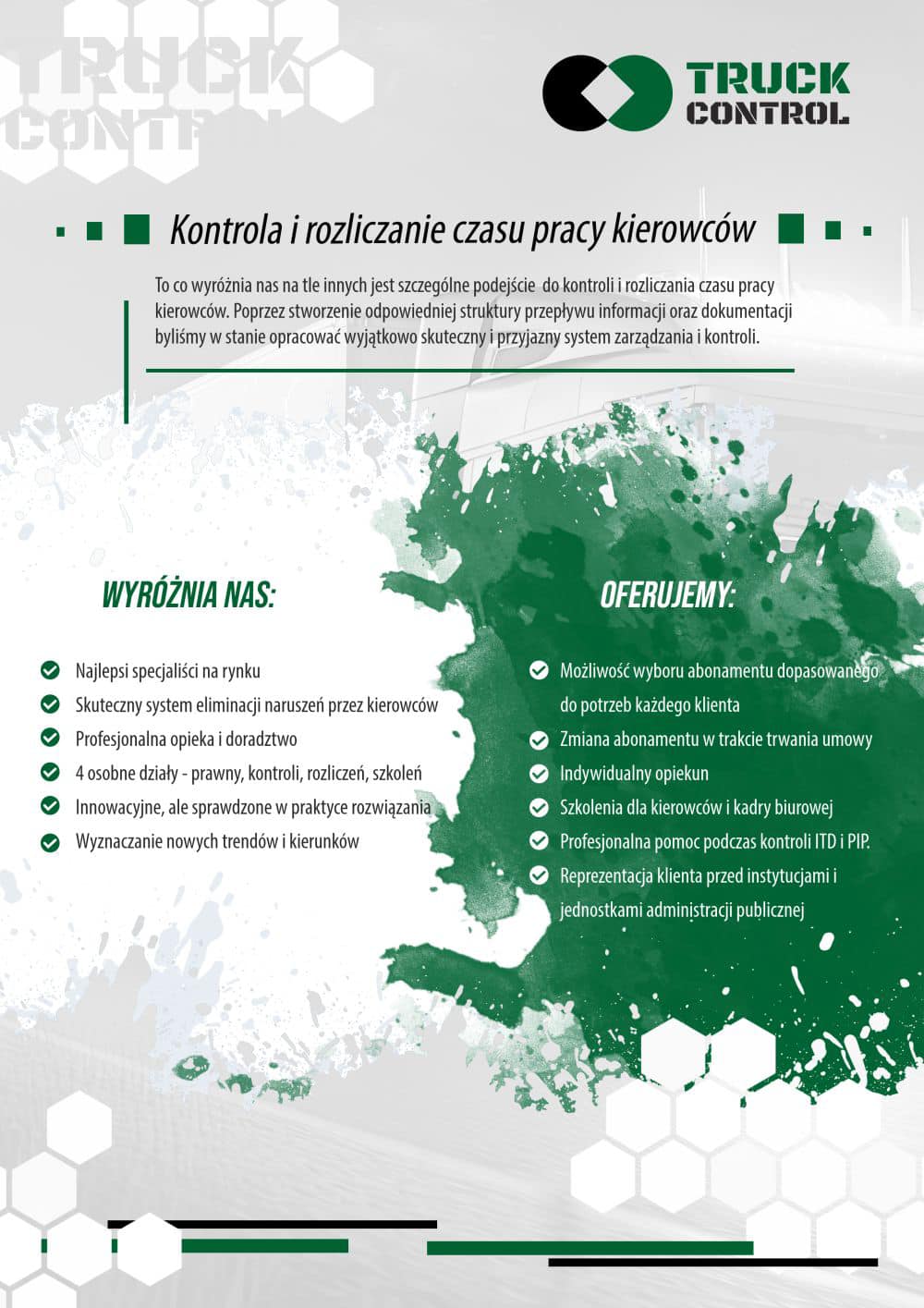 Jesteśmy profesjonalną firmą zajmującą się rozliczaniem czasu pracy kierowców. To co nas wyróżnia od innych to możliwość profesjonalnego przygotowania przedsiębiorstwa w branży transportowej do kontroli służb w tym ITD i PIP. Współpracując z nami masz pewność, że każda kontrola na drodze, czy w siedzibie przedsiębiorstwa nie będzie niemiłym zaskoczeniem. Badanie dobrej reputacji oraz postępowania z nim związane są teraz częstym zjawiskiem, a my wiemy jak przez to spokojnie przejść. Wybierając nas masz pewność, że współpracujesz z najlepszymi w branży.